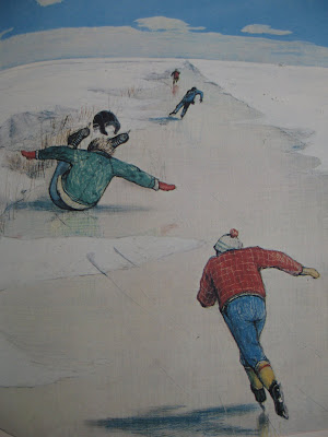 All works by William Kurelek: Crows leaving for the South, 1974 From Joyner Waddington's; Balsam Avenue After Heavy Snowfall 1972 from canadianart.ca; painting of skaters from Great Crested Flycatcher; Children playing in a snowbank, 1971 from Joyner Waddington's; I Triumphed and I Saddened With All Weather, 1970. From Telling Stories
