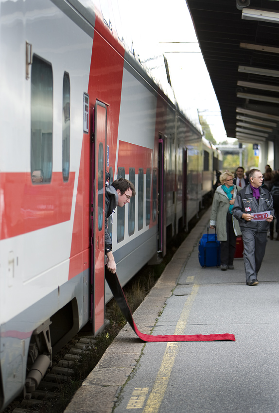 Following on the celebrity-crazed heels of TIFF, I was even more powerless than usual to resist the charms of Montreal artist Vincent Chevalier's satirical twist on fame: The Red Carpet Treatment. With prior performances in Finland and Montreal, and a current one in Kitchener as part of CAFKA, I think Chevalier's cheeky gesture is definitely autograph-worthy. Chevalier took some time to chat with me on the phone about the project this week, and the condensed Q&A is out in today's National Post. An excerpt: